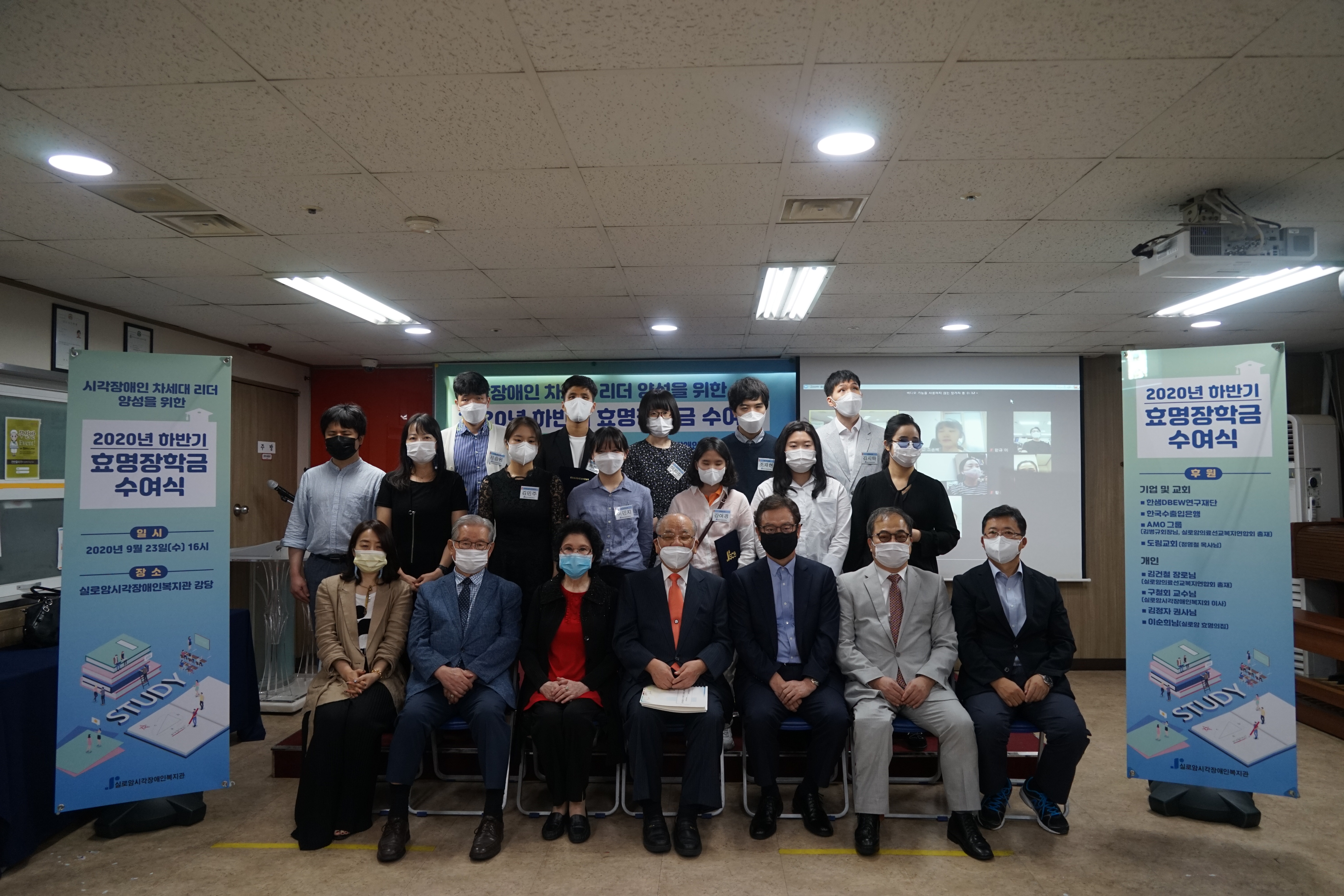 실로암시각장애인복지관에서는 학업성적이 우수하고 인성과 품성이 반듯한 시각장애 대학생 20명을 선발하여, 2020년도 하반기 효명장학금 수여식을 진행하였습니다.