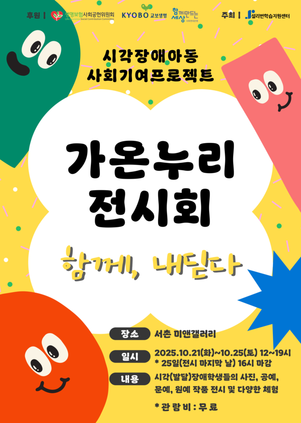 설리번학습지원센터(센터장 노형지)는 2025년 생보위와 교보생명이 지원하는 비영리부문 공익활동의 일환으로 추진된 시각발달아동청소년 역량강화 프로그램 ‘사회기여 프로젝트’의 마지막 단계인 가온누리 전시회를 이달 21일부터 25일까지 종로구 미앤갤러리에서 개최한다고 밝혔다.