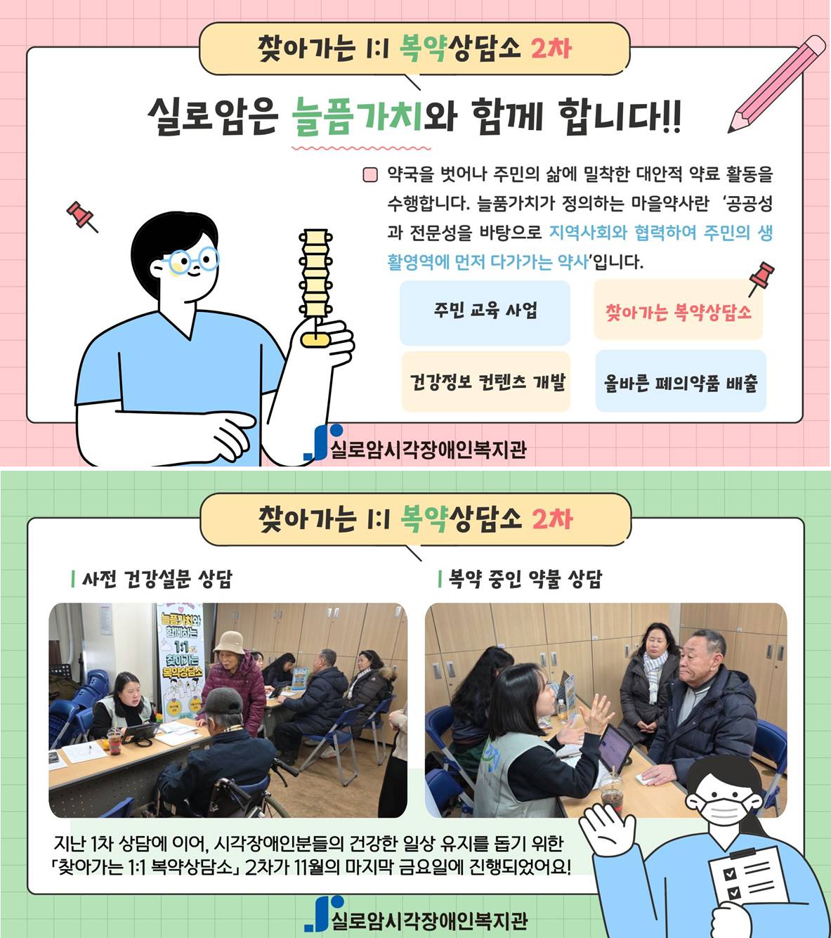 이번 「찾아가는 1:1 복약상담소」 2차는 시각장애인의 복약 접근성을 높이고, 스스로 건강을 관리할 수 있는 역량을 강화하는 데 큰 도움이 된 소중한 시간이었어요. 앞으로도 실로암시각장애인복지관은 늘픔가치와 함께 건강상담 및 복약관리 프로그램을 꾸준히 운영하며, 시각장애인의 건강한 일상을 응원하겠습니다. 시각장애인의 건강한 삶을 함께 만들어가고 싶은 기관이나 단체는 언제든지 기획통합사례지원팀(02-880-0520~4) 으로 연락주세요 :)